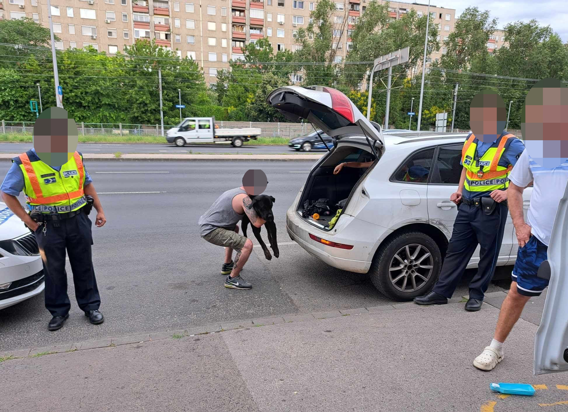 2024. június 21-én, a Budapest III. kerület, Szentendrei út 95. szám előtt a rendőrök megállásra intettek egy autóst, akinél megállapították, hogy alkohol befolyása alatt vezetett. Az ittas vezetés miatt a középkorú férfit elő akarták állítani a Budapest III. Kerületi Rendőrkapitányságra, de a gépkocsiban egy törött lábú, nagytestű kutya is jelen volt, akinek az intézkedés idejére ellátásra volt szüksége. A kutyát az egyenruhások a személygépkocsiban tartózkodó utasra szerették volna rábízni, de az ellenőrzése során kiderült, hogy szökés vétsége miatt országos körözést adtak ki ellene, ezért az ő előállítása is szükségessé vált. Ezt követően az ittas vezető egy másik ismerősét hívta a helyszínre, hogy a kutyáját rábízza. Megérkezett a harmadik ismerős is, aki már-már reménysugárnak tűnt a kutya számára, de sajnos ő is hoppon maradt: kiderült, hogy jogerősen el volt tiltva a vezetéstől. Ő is csatlakozott a rendőrségi vendégek sorához.