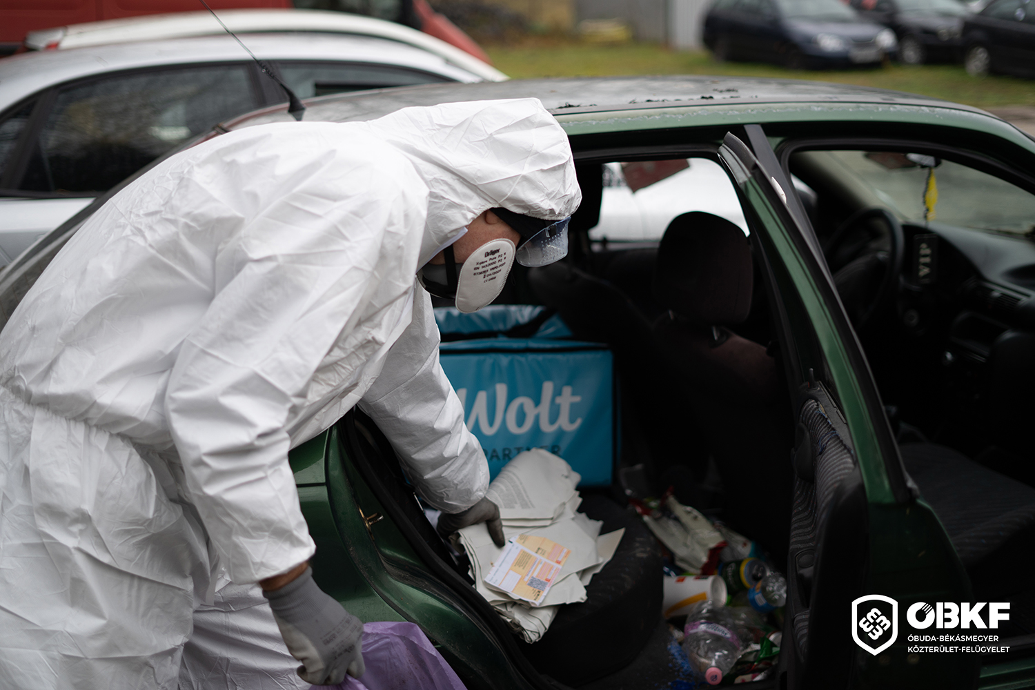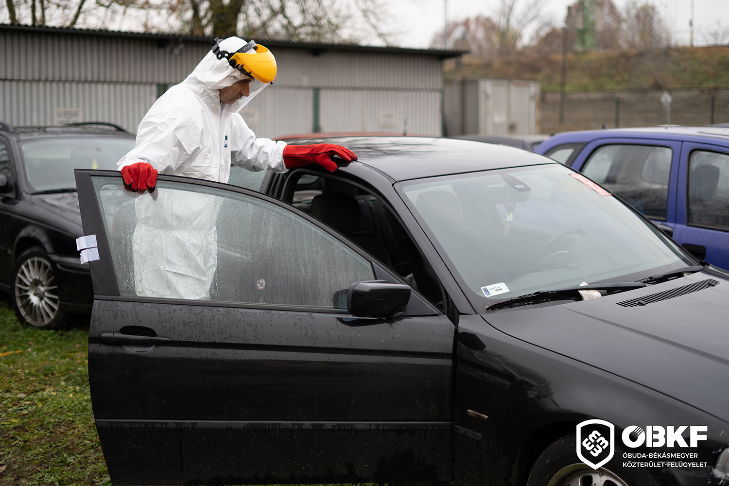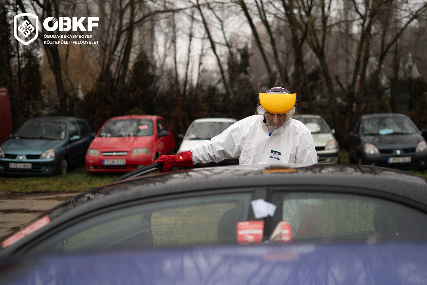 Védőruhában és oltásokkal felszerelkezve dolgoznak a közterület-felügyelet munkatársai, amikor a hónapok óta gazdátlanul álló autókat kiürítik és felkészítik az értékesítésre vagy a megsemmisítésre.