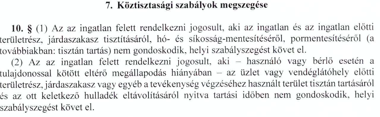 Ez a rendelkezés összhangban áll a 48/1994 (VIII. 1.) Fővárosi Közgyűlés rendeletében foglaltakkal, mely kimondja, hogy az ingatlan tulajdonosa (kezelője, használója) köteles gondoskodni az ingatlan – beleértve az ingatlan nyilvántartásban közterületként nyilvántartott belterületi földrészletet is – és az ingatlan előtti járda, továbbá a járda és a kocsiút közötti kiépített vagy kiépítetlen terület gondozásáról, tisztán tartásáról, szemét- és gyommentesítéséről, hóeltakarításáról és síkosság-mentesítéséről.